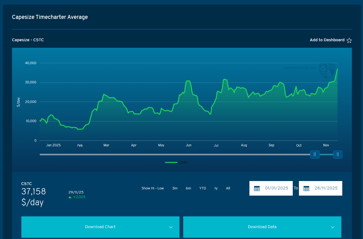 此轮BDI涨势的核心动力来自海岬型船舶(Capesize),该船型运价在全球铁矿石、铝土矿及长航程贸易的支撑下迎来全面爆发,使干散货市场整体进入一个“季节性需求叠加结构性偏紧”的阶段。
