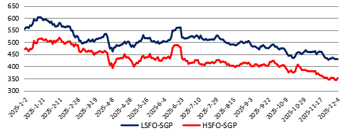 上周新加坡高硫380cst燃料油均价348.4美元/吨,较前一周均价下跌1.8美元/吨,0.5%低硫燃料油均价432.2美元/吨,较前一周均价上涨0.8美元/吨。