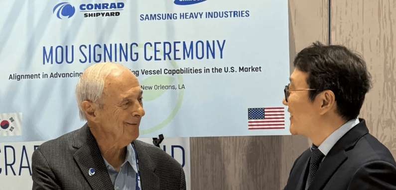 在HD现代深耕南亚的同时,另一家韩国造船巨头三星重工正将目光投向北美市场。近期,三星重工与美国路易斯安那州的康拉德船厂(Conrad Shipyard)签署合作备忘录,正式宣告进军快速扩张的美国LNG加注市场,这也是韩国船企依托政府战略布局美国的关键一步。