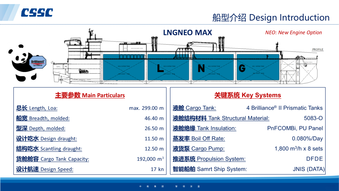 该型新船总长299米,型宽46.4米,型深26.5米,设计吃水11.5米,结构吃水12.5米,设计航速17节,具备舱容大,综合能耗低,围护系统可靠性高、无装载限制,定制化蒸发率(BOR),运营维护成本低,DFDE优势,旧船残值高等7大特点。