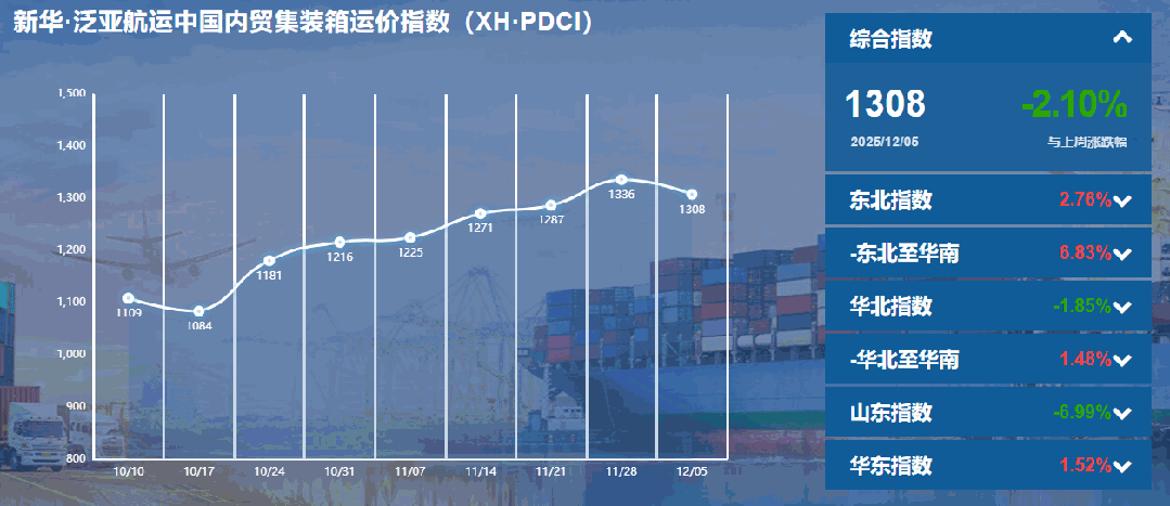核心提示:本期(11月29日至12月5日)新华·泛亚航运中国内贸集装箱运价指数(XH·PDCI)报1308点,较上期(11月22日至11月28日)下跌28点,跌幅2.10%;同比下跌134点,跌幅9.29%;6只区域子指数三涨三跌,4只流向指数三涨一跌。