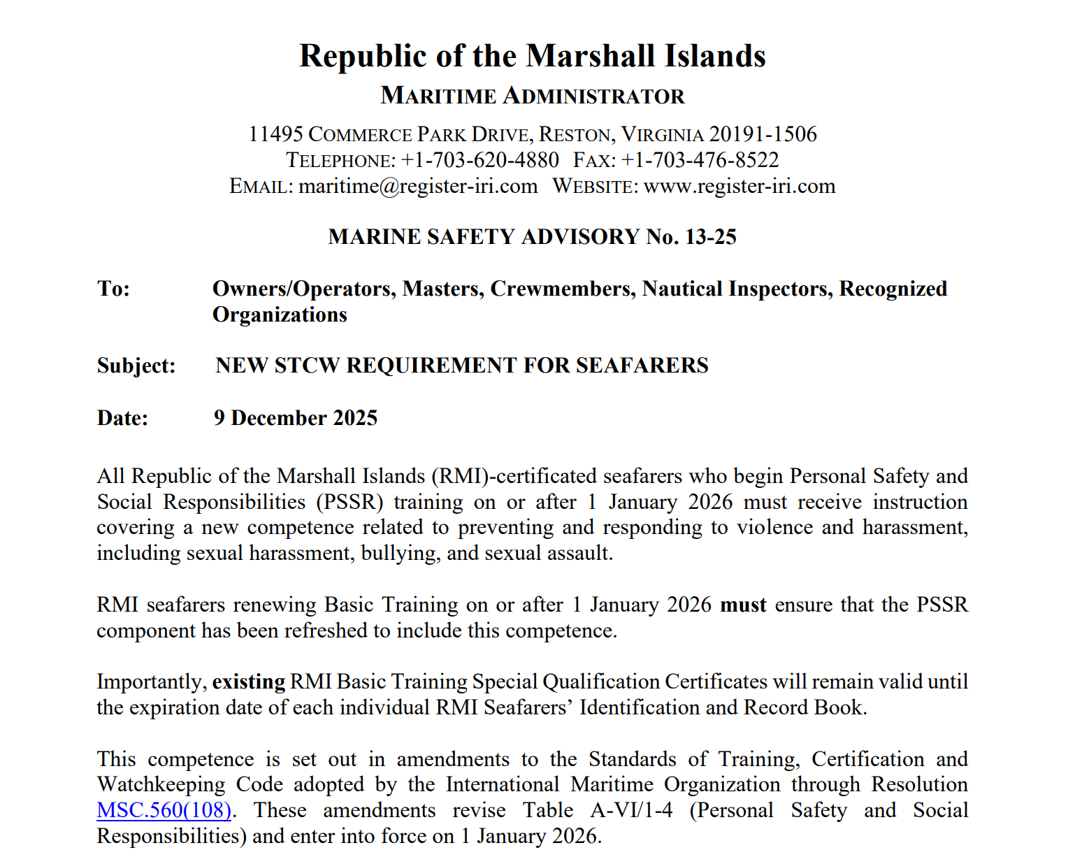 《海员培训、发证和值班规则》2024年修正案(以下简称修正案)经国际海事组织海上安全委员会第108届会议 MSC.560(108)号决议通过,将于2026年1月1日正式实施。为全面履行修正案相关要求,切实维护船员职业安全与身心健康,现就有关事项公告如下: