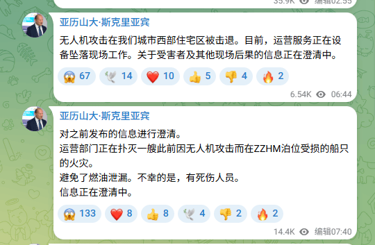 与此同时,罗斯托夫州州长Yuri Slyusar也在Telegram披露港区船舶起火与伤亡,并称火情被扑灭。