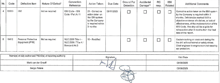 尤其是,PSCO在综合检查后指出,ISM体系存在实施缺陷,要求公司在三个月内完成整改,且船舶需在报告发布后三个月方可申请复查。