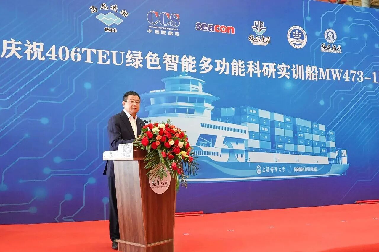 宋宝儒代表上海海事大学向参与船舶建造的各方表示感谢。他指出,当前全球航运业正经历一场以绿色化、智能化、低碳化为标志的深刻变革。这既是历史机遇,更是换道超车服务交通强国、海洋强国建设的重要抓手。这艘科研实训船的建造,集中体现三方面创新:一是推动航运新质生产力发展。围绕航运“三化”转型,推动“设计—建造—试验—应用”全链条贯通,聚焦自主航行与岸基驾控、智能机舱运维等关键领域,力争成为全球首艘符合IMO MASS规则的示范船;二是打造政产学研用融合的科研新范式。坚持与各方合作单位“优势互补、协同攻关、场景牵引、标准先行”,形成深度融合的创新模式,做成行业可复制、可推广的标杆工程;三是推进高素质航运人才培养。落实“为科服务、为产育人”的理念,推动人工智能、绿色能源等前沿科技融入课程体系,培养具有船端操作、岸基管理与系统研发能力的复合型人才,为航运事业高质量发展提供坚实人才支撑。