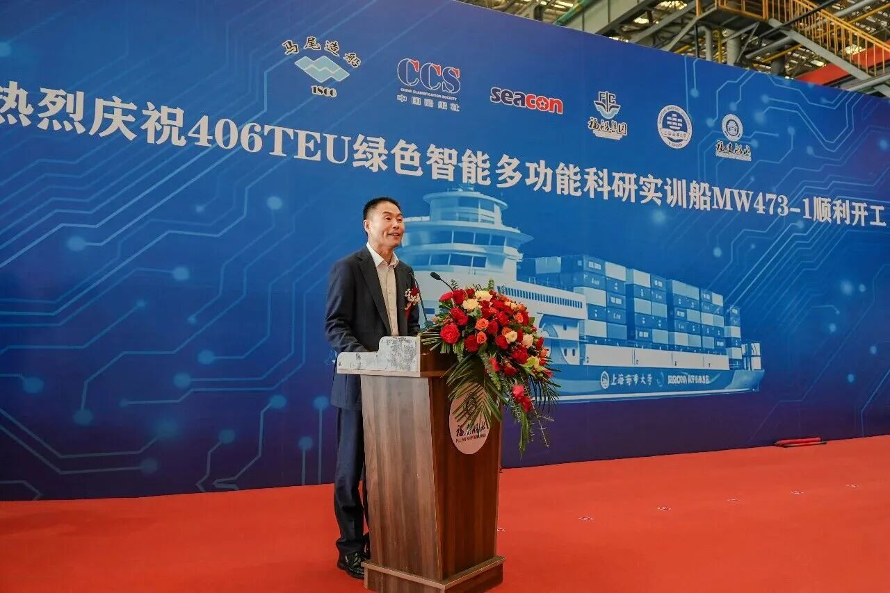 12月29日,洲际船务与上海海事大学在福建省马尾造船股份有限公司船体车间举行406TEU绿色智能多功能科研实训船开工仪式。上海海事大学党委书记宋宝儒,福建省船舶工业集团有限公司党委书记、董事长赵金杰,洲际船务集团董事长郭金魁,福建船政重工股份有限公司党委书记、董事长黄如堂,中国船级社原总裁孙峰,中国船级社福州分社党委副书记、总经理林剑锋,中集船舶海洋工程设计研究院院长尹逊滨,中国船舶集团第七〇八研究所船海产业部副主任叶爱君,东湖实验室绿色交通创新中心副主任邓芳,潍柴重机股份有限公司技术中心副主任靳良真等嘉宾出席,开工仪式由福建船政副总经理、马尾造船总经理周建主持。