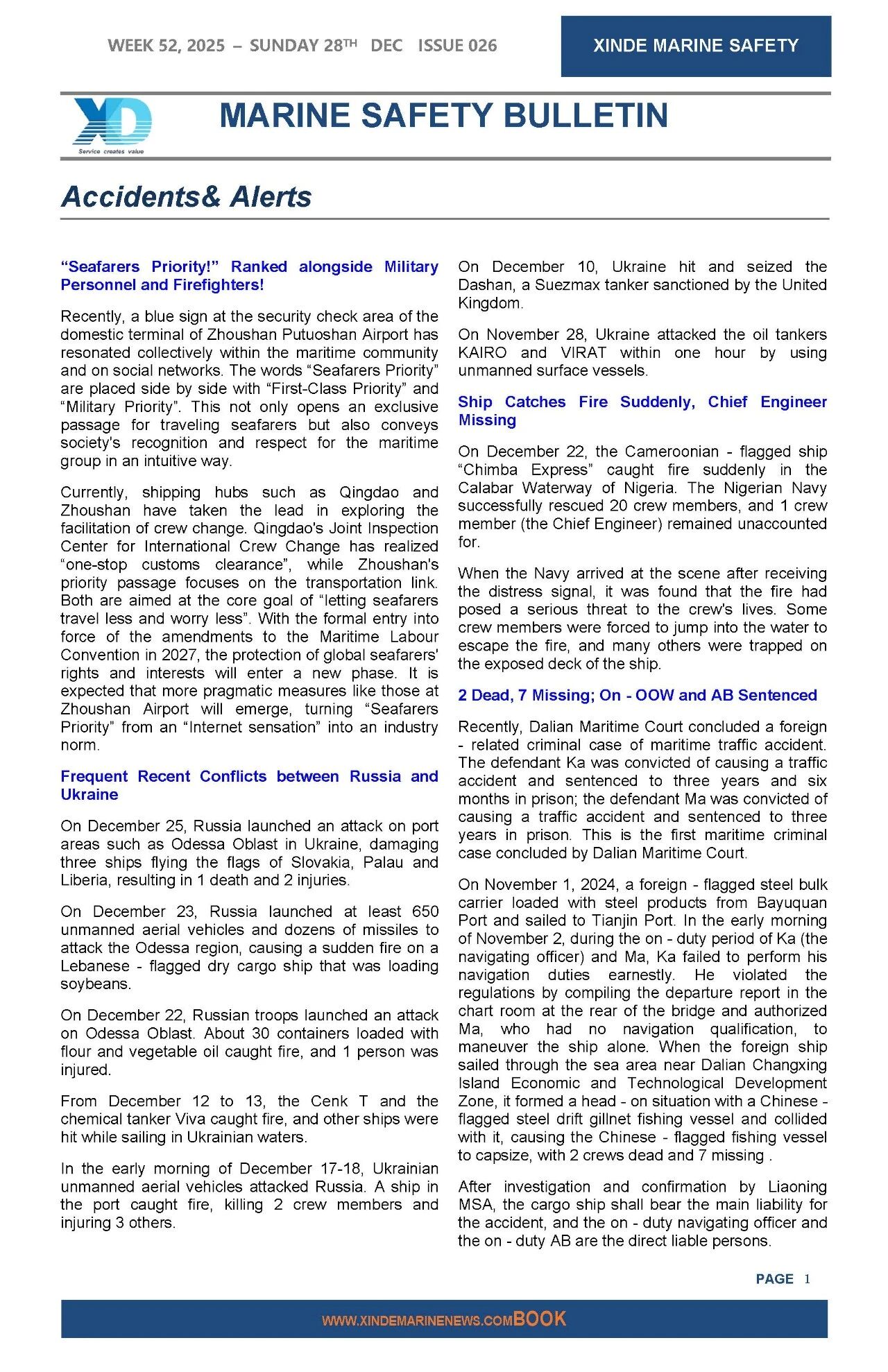 信德海事一直把实现海上更安全当作我们的愿景之一。2020年8月22日正式推出《信德海事安全周报》,2021年1月,《信德海事安全月报》上线;2021年2月,《信德海事安全指南》上线;2025年7月,《MARINE SAFETY BULLETIN》上线,实现中英双语发布。如有船公司需订阅以上产品,请发送邮件:safety@xindemarine.com,或联系主编:18641784019(微信)。