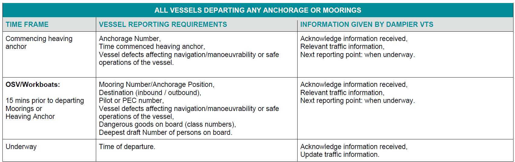 Dampier VTS 要求船舶在港期间值守 CH 11/16频道, 通常对于到港的船舶需要提前4小时通过高频呼叫,交管通常会指示下次报告的位置,以下为Dampier 到,离港的报告制度供参考: