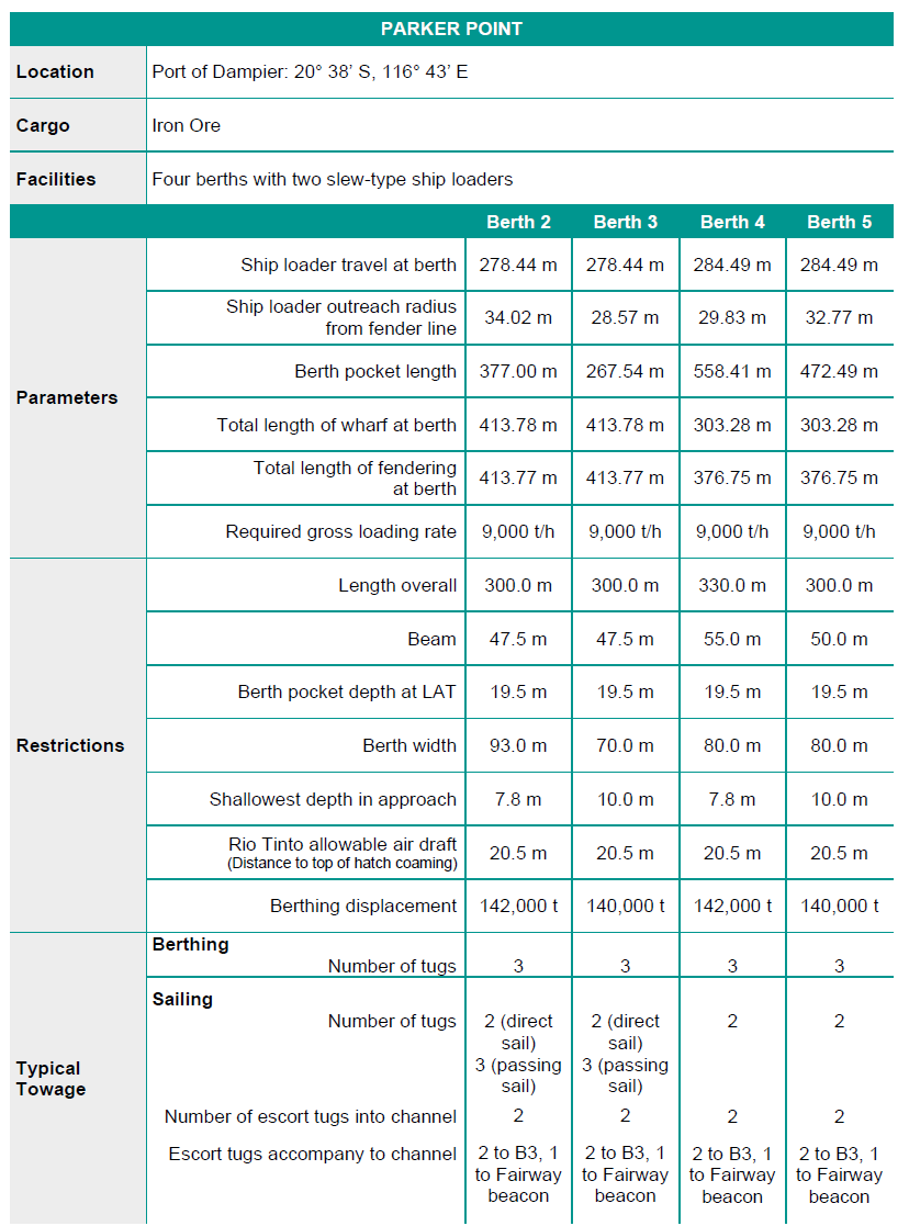 在Dampier港,力拓共计5个装矿码头,分别为Parker point 2/3/4/5 and East Intercourse Island。Parker point 3/5 和East Intercourse Island 码头为右舷靠泊,Parker point 2/4 为左舷靠泊。 船舶确定靠泊时间后,交管中心会跟船确认引水时间,靠泊的泊位,哪一舷靠泊,需要靠泊一侧的舷梯放置到主甲板位置并安全网包裹(扶手到扶手)。