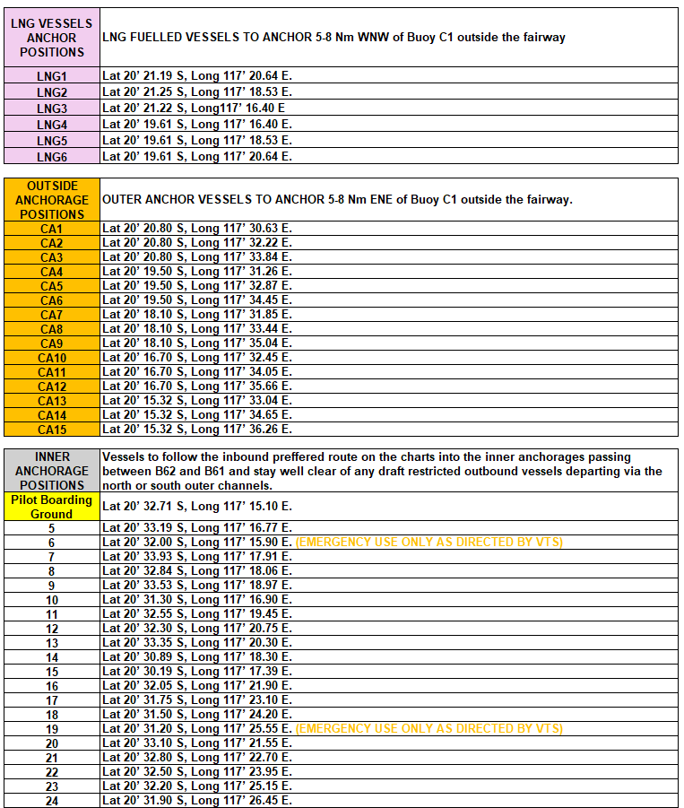 到港前约1-2天,代理会发邮件告知船舶预计的锚位,但到港前还需要再次于Channel 14 呼叫 ‘Port Walcott Base’确认,笔者本次到港就遇到临时由交管更改锚位的情形,故切不可未经与交管核实直接至代理指定锚位抛锚的情况发生。散货船锚位位于通过C1 BUOY,B61/B62 后,24个锚位位于进港航路的两侧。对于LNG 燃料的船舶共计6个锚位位于航道外侧C1 灯浮的西北偏北5-8海里。任何计划进行主机保养的船舶只能抛锚在外锚地且至少提前24小时前进行报告,外锚地共计15个,位于航道外C1 灯浮的东北偏东侧5-8海里。以下代理发船的锚位信息供考: