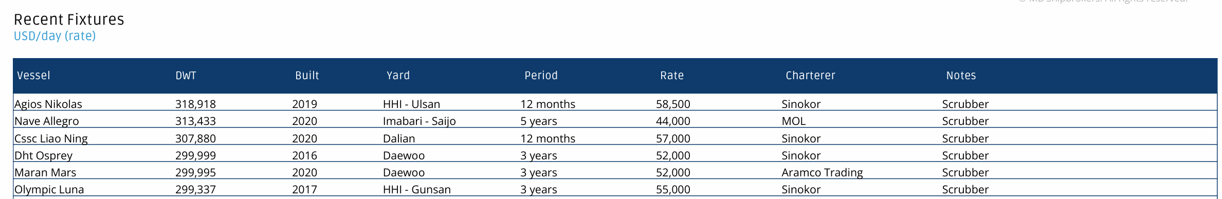 ● CSSC Liao Ning(307,880 DWT,2020)12个月 57,000美元/天(Scrubber)