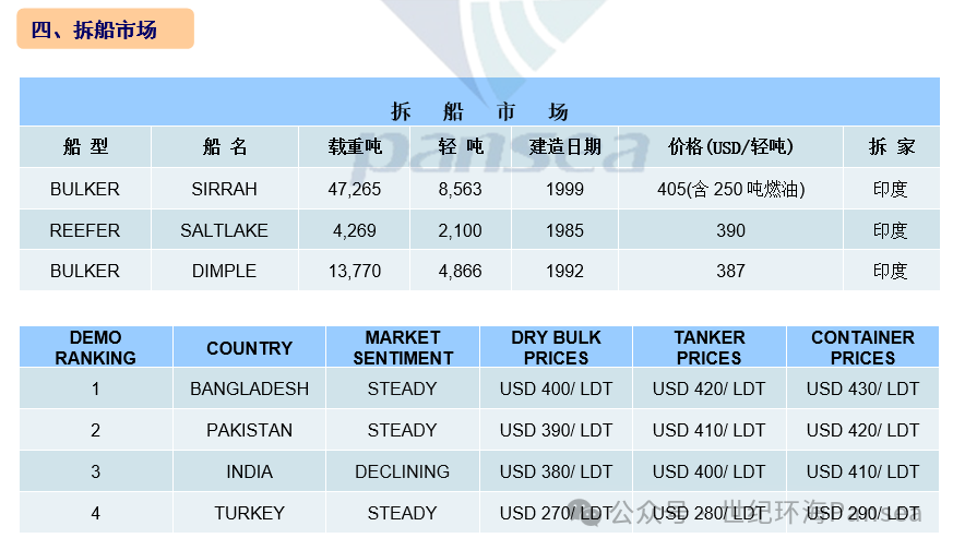 拆船市场,2026年若局势持续动荡,航运业和船舶回收业将面临多重挑战。特朗普政府近期的一系列举措——劫持委内瑞拉总统及其夫人宣称接管该国、威胁要将格陵兰岛纳入美国的版图、两天内扣押3艘与委内瑞拉石油有关的油轮,都预示着今年的疯狂局面。全球市场一如既往地呈现出混乱和波动的态势。波罗的海指数本周继续下跌,而油价小幅上涨至约59.5美元/桶。货币市场再度出现大幅波动,对拆船国造成冲击。当地钢板价格在上涨和下滑中反复,目前仍低于前两周的水平,这一趋势蔓延至船舶回收行业。孟加拉国市场,该市场在经历上周的骤跌后,本周出现复苏迹象。当地需求有所好转,但国内内乱持续,仍影响市场情绪。本周仅有一艘新船抵达并完成交付。供需失衡的局面可能会使该市场在未来一段时间内锚地空无一船。此外,由于达卡中央银行人员的变动,近期的几份信用证受到了延误。国内基本面方面,孟加拉国塔卡兑美元的汇率上涨9个基点,收于BDT 122.26;当地钢板价格再次开始交易,本周中期约为500美元/吨——虽不是理想价位,但比竞争对手还是占据优势。该市场的形势或许会保持平静直至选举结束。印度市场,在当前全球政治和经济形势动荡、市场充满不确定性的情况下,印度买家通常都比较谨慎,市场情绪已经有所减弱。本周当地钢板价格下跌6美元,再次回落至400美元/吨。印度卢比兑美元的汇率下跌20个基点,收于RS.90.21。鉴于拆解标的供应依然不足,这些预期中的下降数据在短期内不太可能产生任何影响。本周至少有一艘船舶抵达阿朗,摆脱空港困境。巴基斯坦市场,巴基斯坦卢比汇率稳定、钢板价格更具竞争力(较印度高185美元/吨),但市场活跃度不足,需采取更积极举措提升产能与市场份额。伊朗局势动荡导致其进口放缓,为巴基斯坦提供了潜在市场空间,但自身金融资源未有效转化为实际交付能力——2025年仅交付202艘船舶。目前为止,符合《香港公约》的船厂数量依然有限,加上临时DASR的障碍,以及限制新资金流入,进一步加剧市场萧条。国内基本面方面,巴基斯坦卢比兑美元的汇率上涨7个基点,收于PKR 280.12,当地钢板价格上涨约6美元/吨,收于585美元/吨。