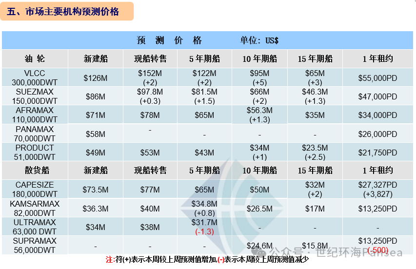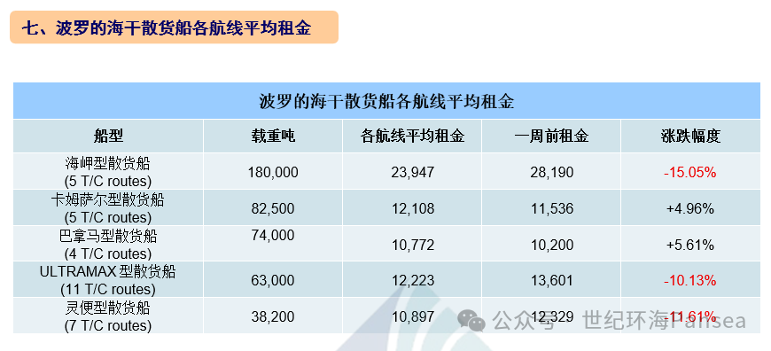 海岬型散货船5条航线平均日租金23,947美元,较一周前下跌15.05%;卡姆萨尔型散货船5条航线平均日租金12,108,较一周前上涨4.96%;巴拿马型散货船4条航线平均日租金10,772美元,较一周前上涨5.61%;ULTRAMAX型散货船11条航线平均日租金12,223美元,较一周前下跌10.13%;灵便型散货船7条航线平均日租金10,897美元,较一周前下跌11.61%。