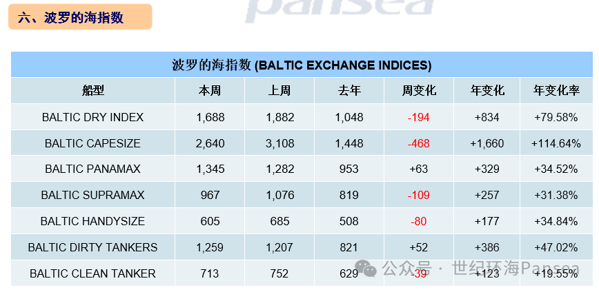 本周干散货运输市场,除巴拿马型船型运价指数上涨外,其他船型运价指数均下跌。其中,海岬型船运价指数继续下滑468点,巴拿马型船运价指数止跌回升63点,超灵便型船运价指数下滑109点,灵便型船运价指数下行80点,最终波罗的海干散货综合运价指数(BDI)收于1,688点,跌幅为10.31%。