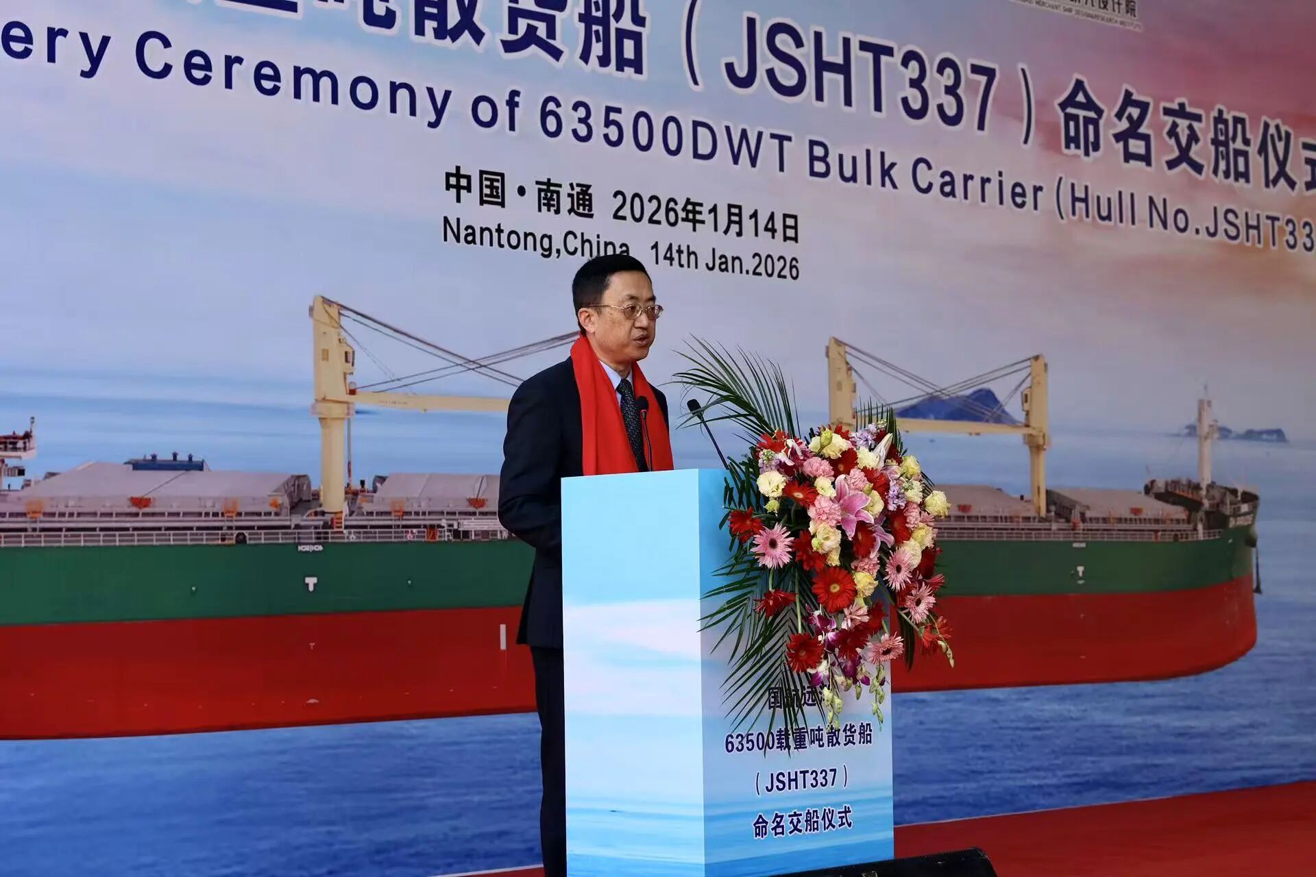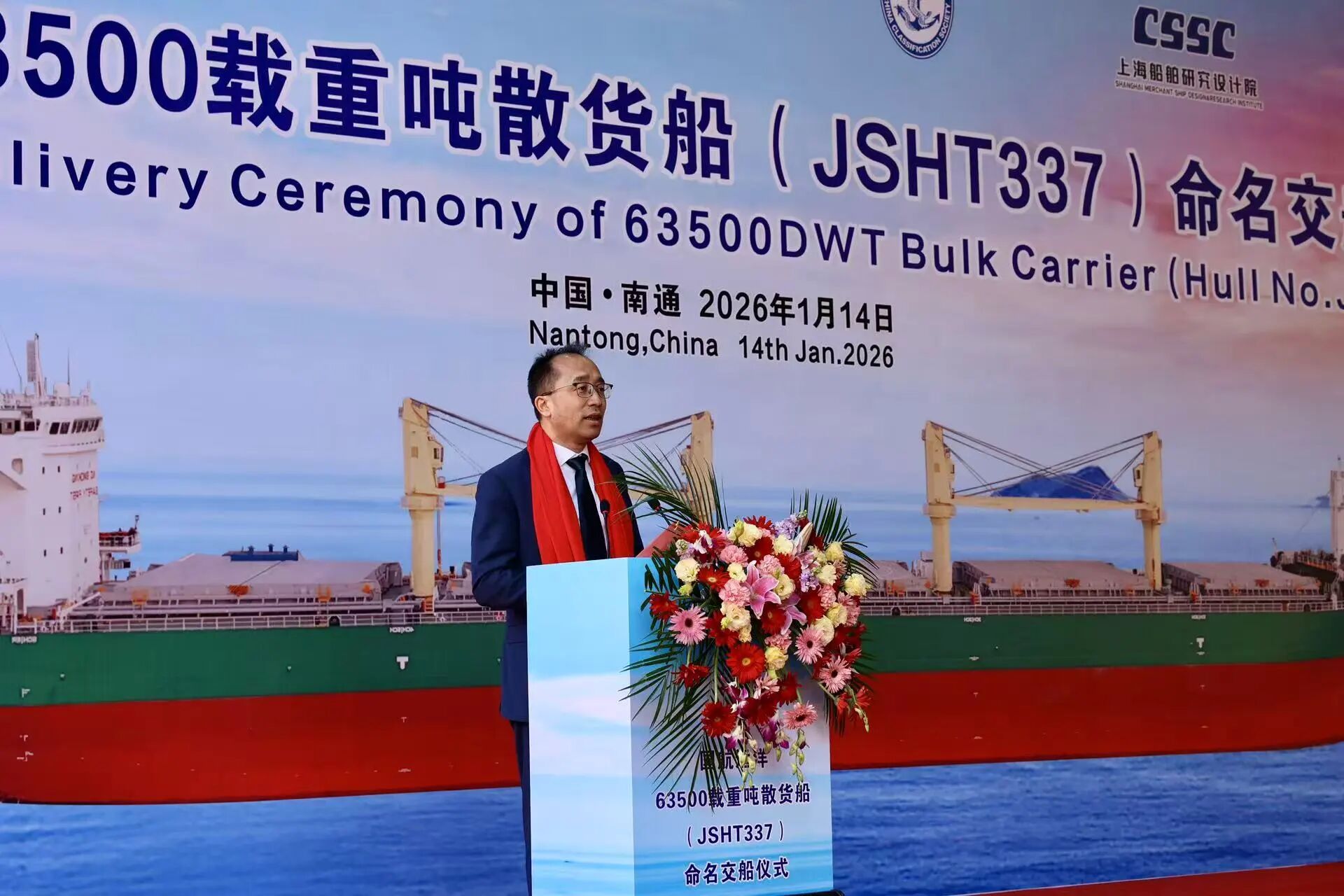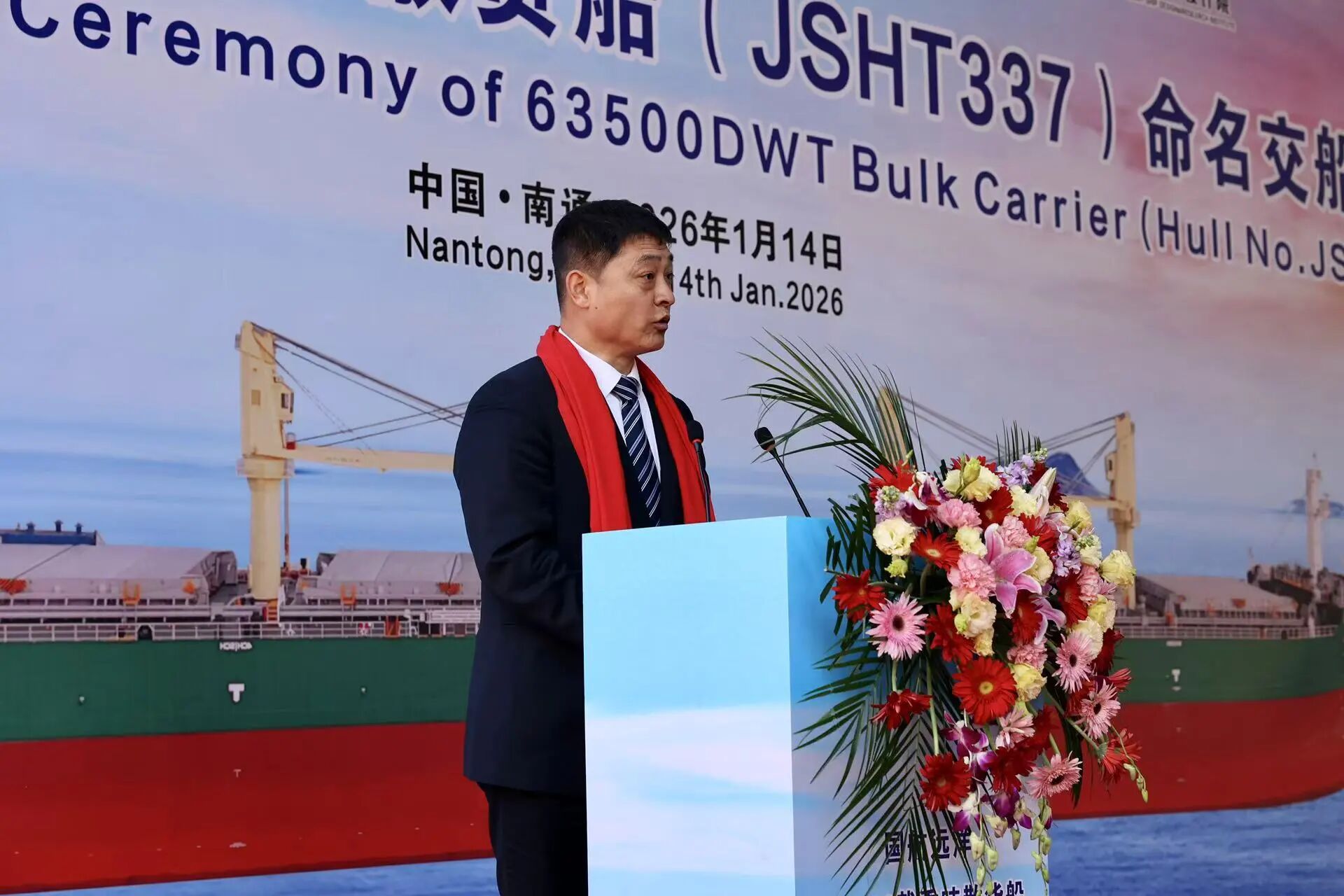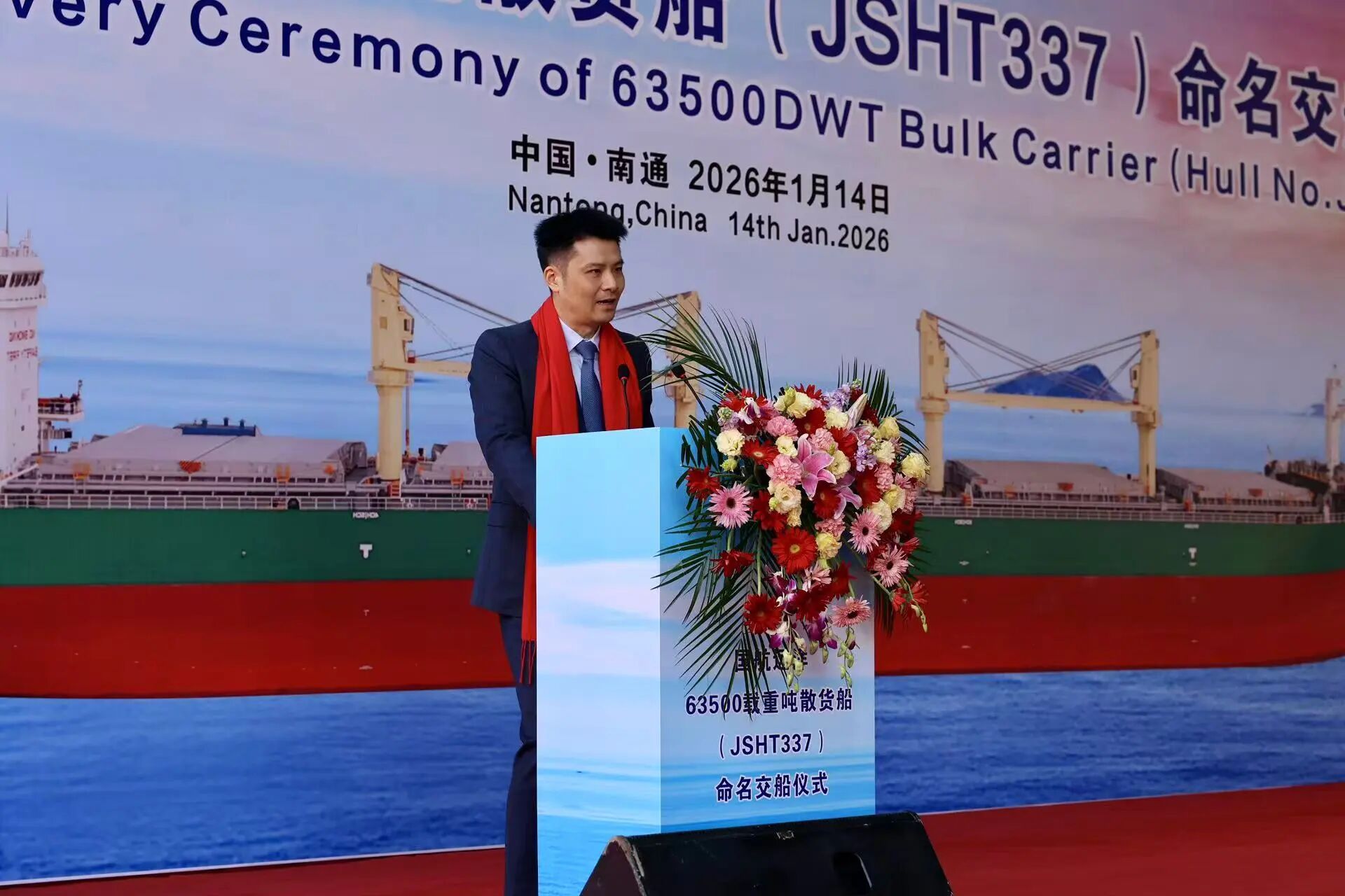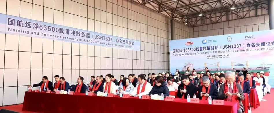 仪式现场,江苏海通副总经理王鹤飞致欢迎辞,向到场嘉宾致以诚挚问候,回顾了与国航远洋的精诚合作历程;中国船级社南通办事处主任于得会等嘉宾先后登台致辞,对“GH PRIDE”轮的顺利交付表示祝贺,高度肯定该船在技术创新与绿色环保方面的突出优势。