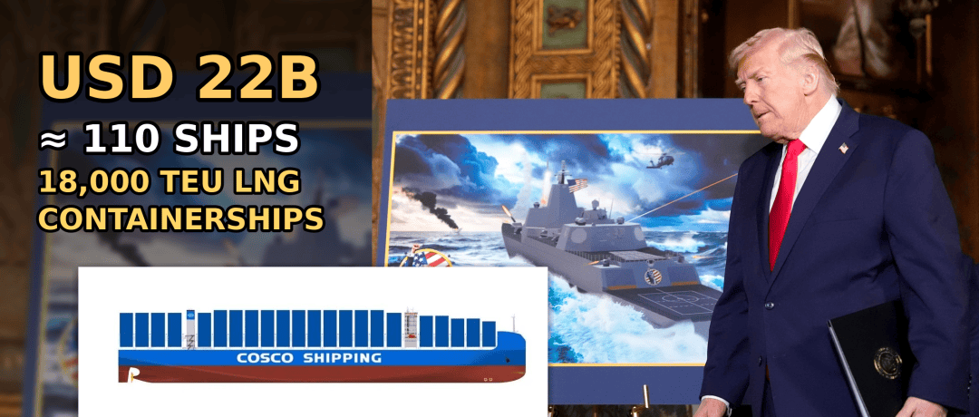 以同日市场常用口径1美元≈6.98元人民币进行换算,单船造价约为13.99亿元÷6.98≈2.01亿美元/艘。于是,220亿美元÷2.01亿美元/艘≈110艘。这就是标题背后的粗暴逻辑就是:一艘“220亿美元级别”的特朗普级战舰,其资金量大致相当于约110艘中远海控同规格的18,000TEU LNG双燃料大型集装箱船。