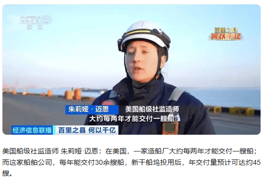美国船级社(ABS)监造师朱莉娅·迈恩在央视财经相关报道中表示, “在美国,一家造船厂大约每两年才能交付一艘船;而这家船舶公司(指的是新时代船厂),每年能交付30余艘船,新干船坞投用后,年交付量预计可达约45艘。”这句话的冲击力不在情绪,而在工业常识:当交付频率低、批量不足,设计—建造—试航—改进的迭代难以滚动,供应链也难以围绕稳定订单形成规模化降本;“慢”会反过来推高“贵”,并进一步削弱接单能力,形成典型负循环。