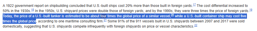美国国会研究服务处(CRS)在《琼斯法案》相关报告中给出过非常直白的口径:美国建造油船的价格约为全球同类的4倍;美国建造集装箱船的价格可能达到全球同类的5倍。