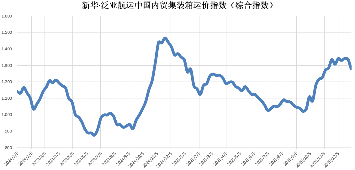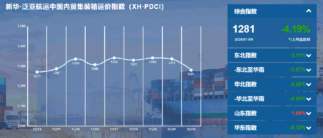 核心提示:本期(2026年1月3日至1月9日)新华·泛亚航运中国内贸集装箱运价指数(XH·PDCI)报1281点,较上期(2025年12月27至2026年1月2日)下跌56点,跌幅4.19%;同比下跌54点,跌幅4.04%;6只区域子指数两涨四跌,4只流向指数一涨三跌。