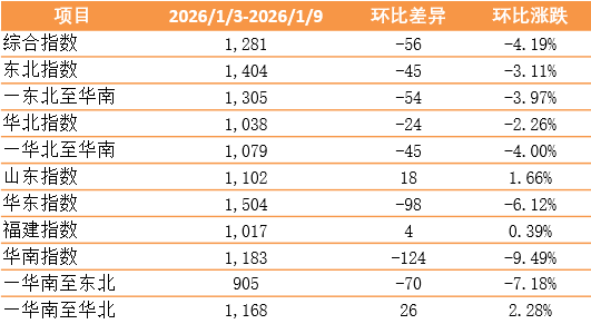 此外,山东指数报1102点,环比上涨18点,涨幅1.66%;华东指数报1504点,环比下跌98点,跌幅6.12%;福建指数报1017点,环比上涨4点,涨幅0.39%。