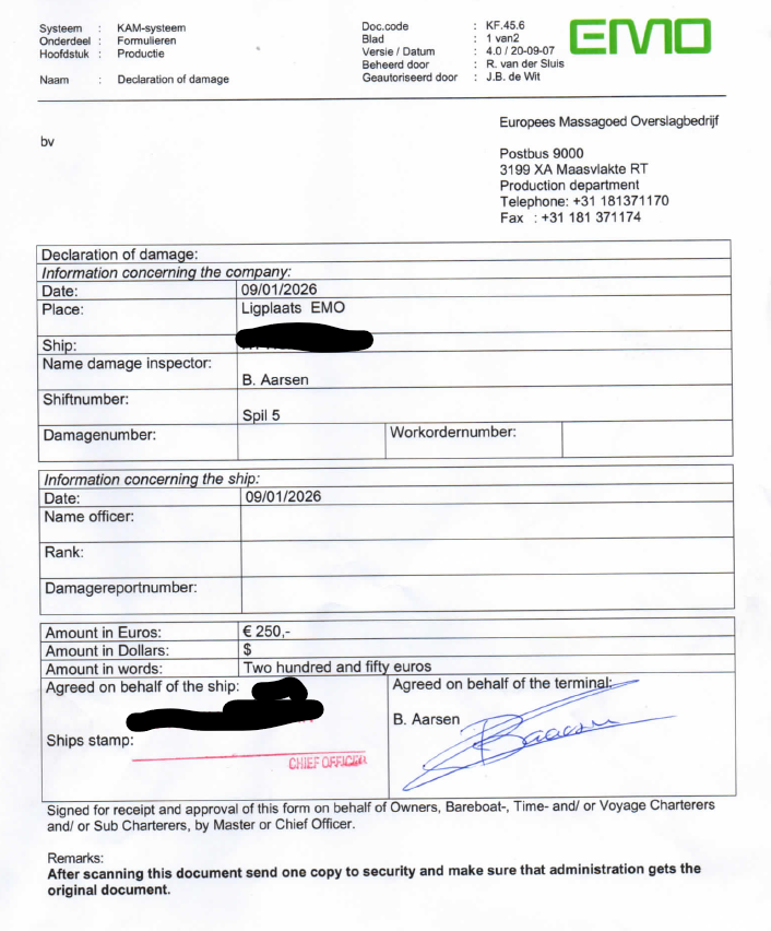 - 对方承认责任并支付赔偿:码头方面在收到报告后未予否认,反而主动承认损坏事实,并同意由船方修复,最终支付250欧元作为赔偿,形成事实与责任的双重确认。