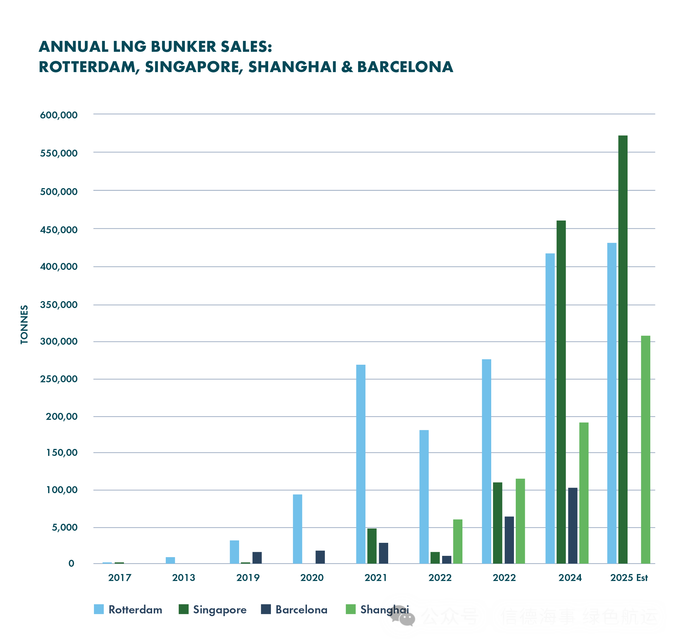 2025年更显著的变化,是LBM(液化生物甲烷)在欧洲加注的快速放量。报告直言,过去一年欧洲LBM加注“出现爆发式增长”,主要由更严格的欧盟监管要求以及客户侧自愿减排承诺共同驱动;LBM加注已经在比利时、法国、芬兰、意大利、立陶宛、荷兰、挪威、西班牙、瑞典和英国等关键港口展开,并至少涉及10家主要加注供应商。