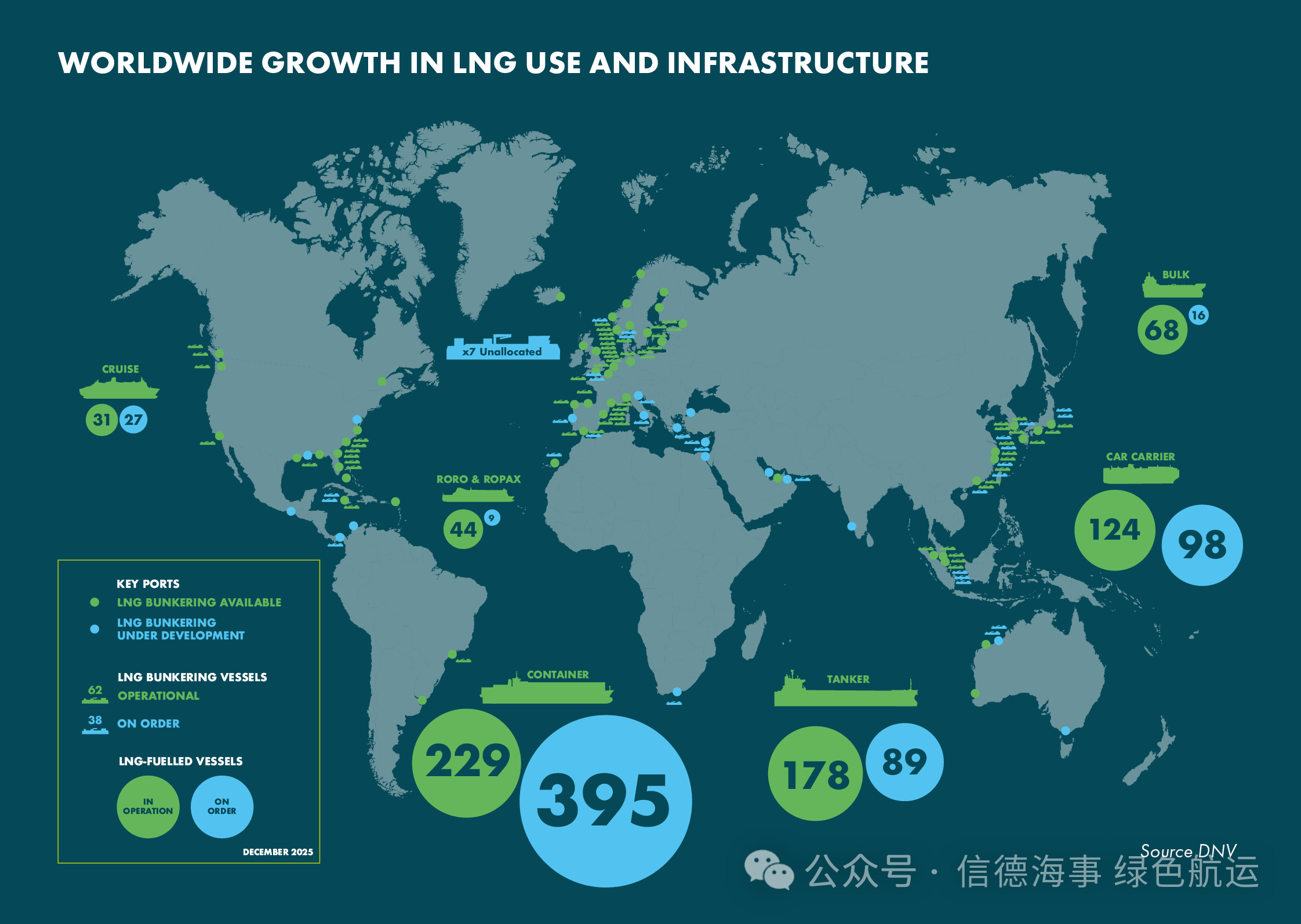 这种“结构性偏好”背后,是LNG船队规模与港口供给体系的同步扩张。报告称,自2016年SEA-LNG成立以来,使用LNG作为船用燃料的双燃料船舶已增至约850艘在运营、642艘在手订单;若计入LNG运输船队,LNG动力全球船队(运营+在建)已约占全球船队载重吨的10%,LNG从2016年北欧的“小众方案”转变为全球主流燃料选项。