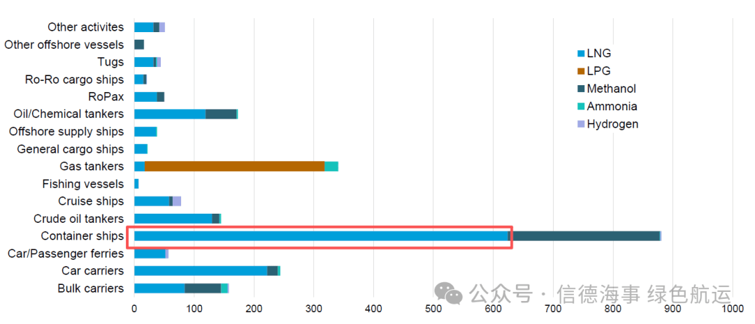 而在集装箱船板块,2025年(底)新造船订单增547艘,其中58% 为 LNG,36% 为常规燃料,6% 为甲醇。