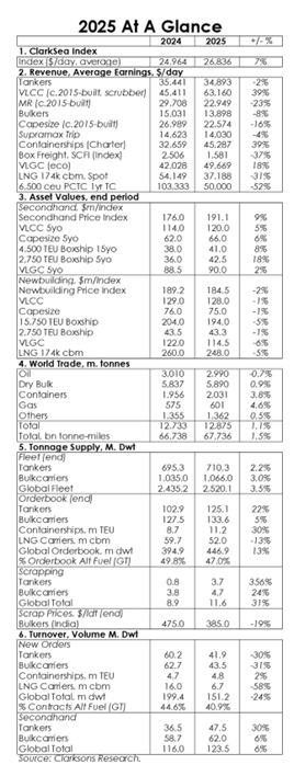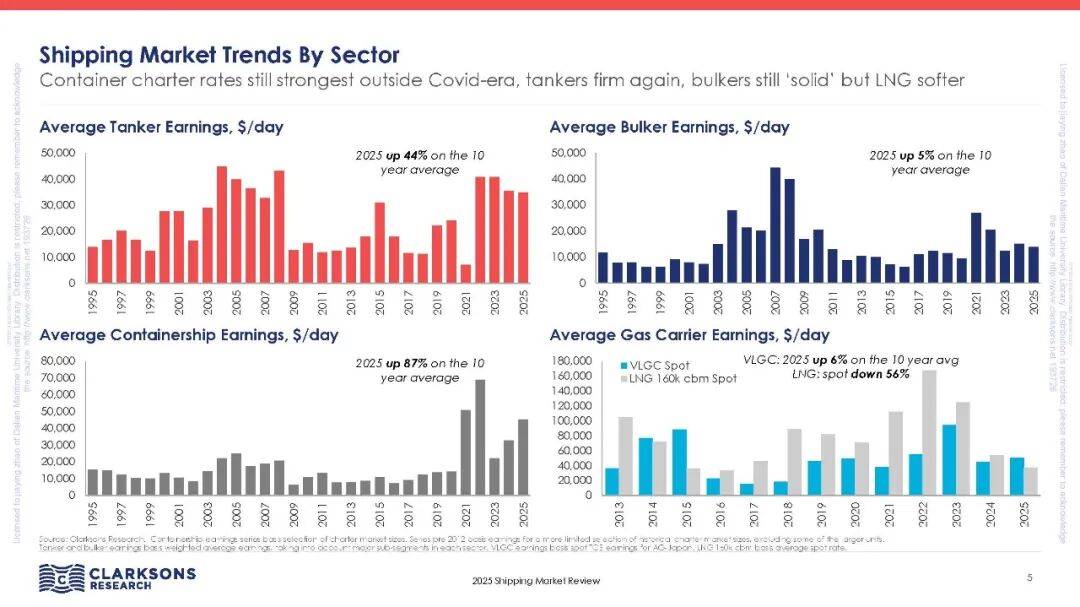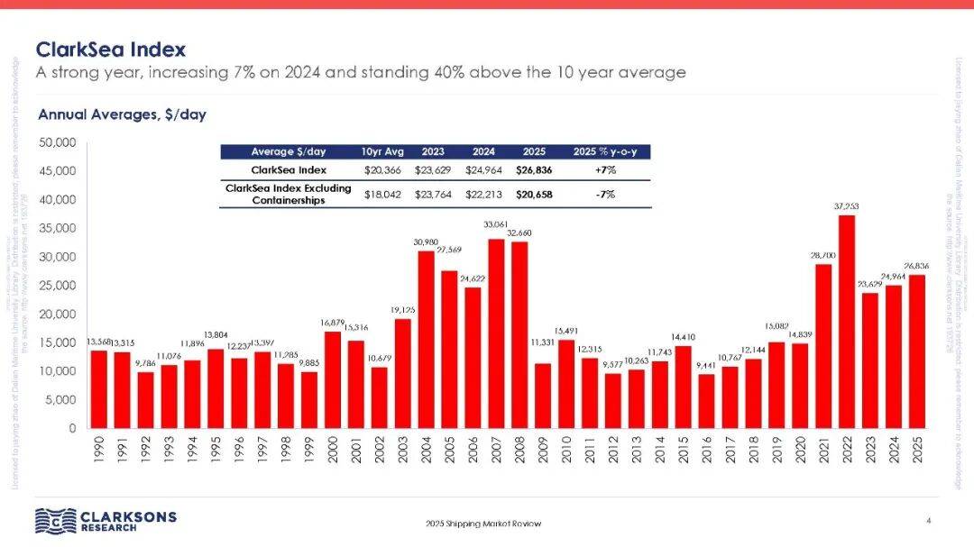 在地缘政治与贸易摩擦反复扰动的一年里,航运并未如市场年初担忧的那样走向全面降温。克拉克森研究在《2025 Shipping Market Review》中指出,尽管外部不确定性持续“拍打”市场,该机构反映主要航运板块日均收益的 ClarkSea Index 仍同比上升7%至26,836美元/天,其背后既有集装箱租船市场的强势带动,也有油轮与干散在下半年明显改善的共同贡献。
