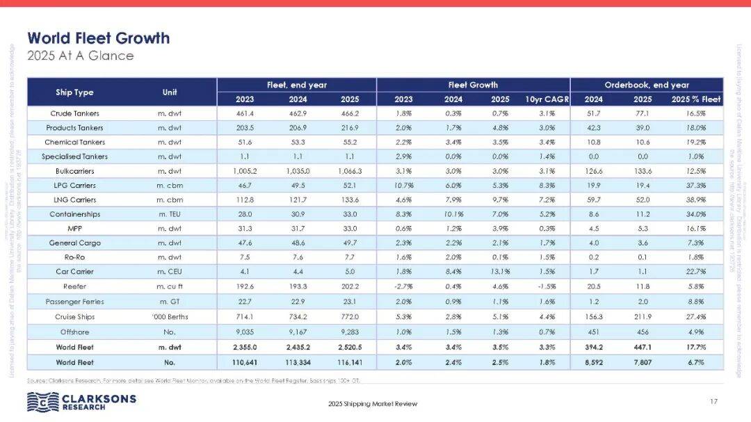 供给端的核心事实是:船队仍在扩张,且扩张速度高于贸易量增速。在“2025 At A Glance”表中, 全球船队运力(以载重吨计)由 2,435.2百万载重吨增至2,520.1百万载重吨(约+3.5%)。当贸易量增速仅在1%左右徘徊时,供给端的中枢抬升意味着市场更容易走向结构性分化:强势板块继续“吃紧”,而新增供给较为集中的板块则更容易出现回调。