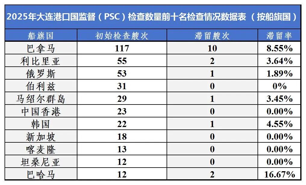 2025年大连港口国监督(PSC)初查受检艘次排名前三的船旗国分别是巴拿马(117艘次)、利比里亚(55艘次)和俄罗斯(53艘次)。
