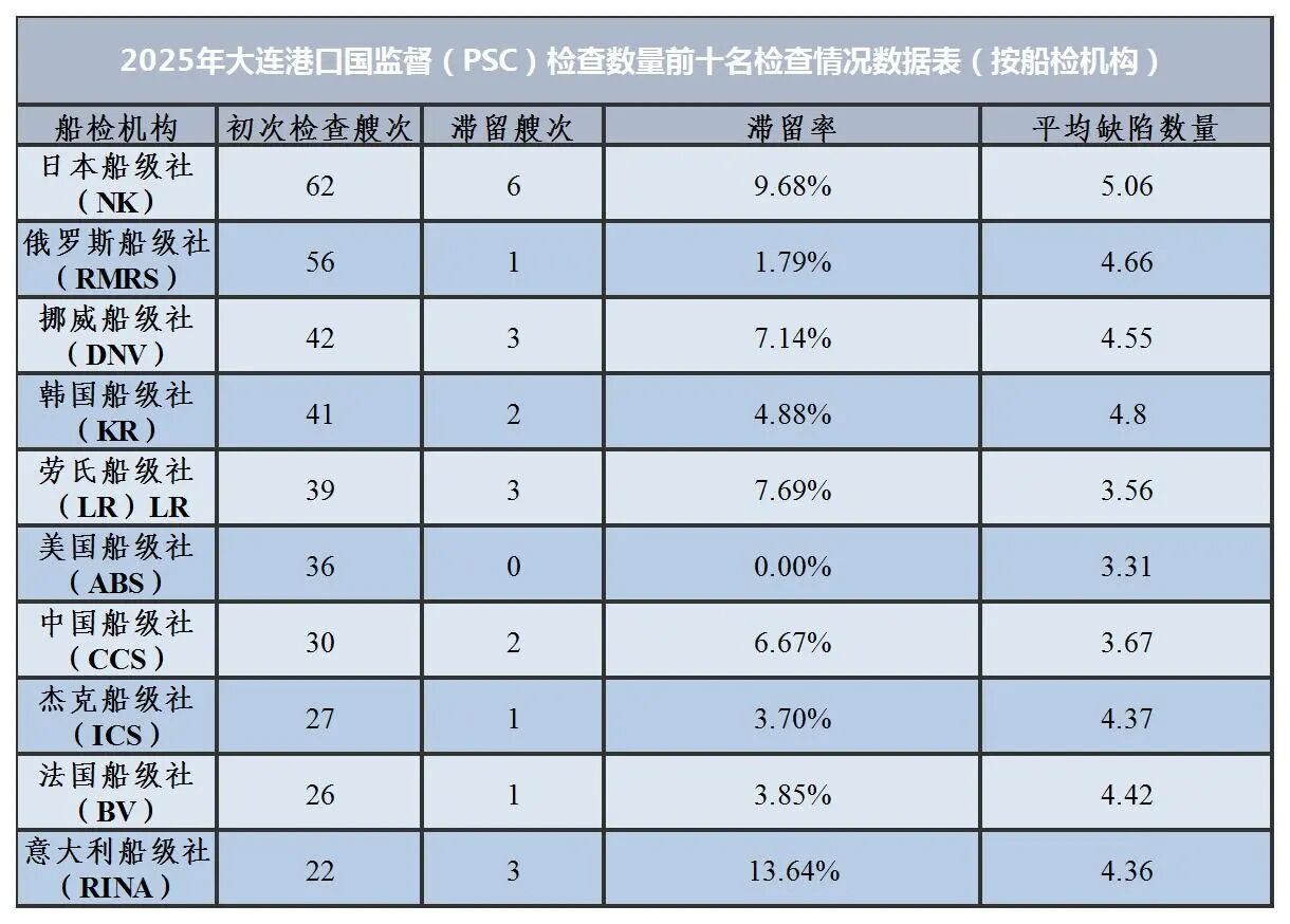 2025年大连港口国监督(PSC)初次检查艘次排名前三的船检机构分别是日本船级社(62艘次)、俄罗斯船级社(56艘次)、挪威船级社(42艘次)。检查数量前十名的船检机构中滞留率排前三名(接受检查20艘次以上)的分别是意大利船级社(13.64%)、日本船级社(9.68%)和劳氏船级社(7.69%)。单船平均缺陷数量排名前三的船检机构分别是日本船级社(5.06项)、韩国船级社(4.80项)和俄罗斯船级社(4.66项)。