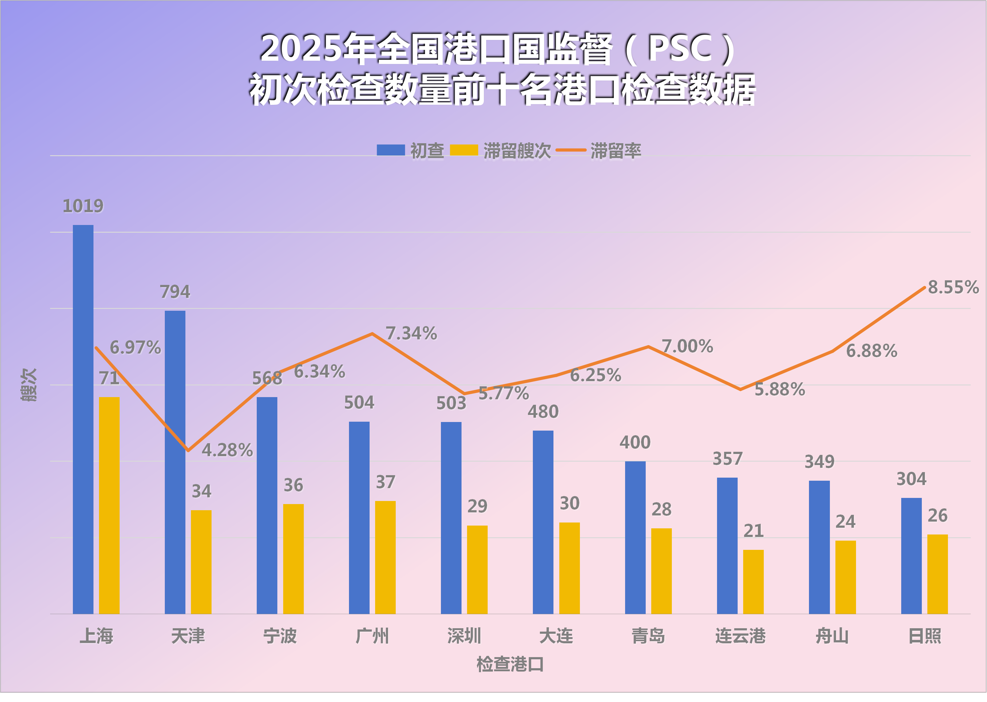 2025年,大连港口国监督(PSC)初查数量创10年来新高,居全国第六位。
