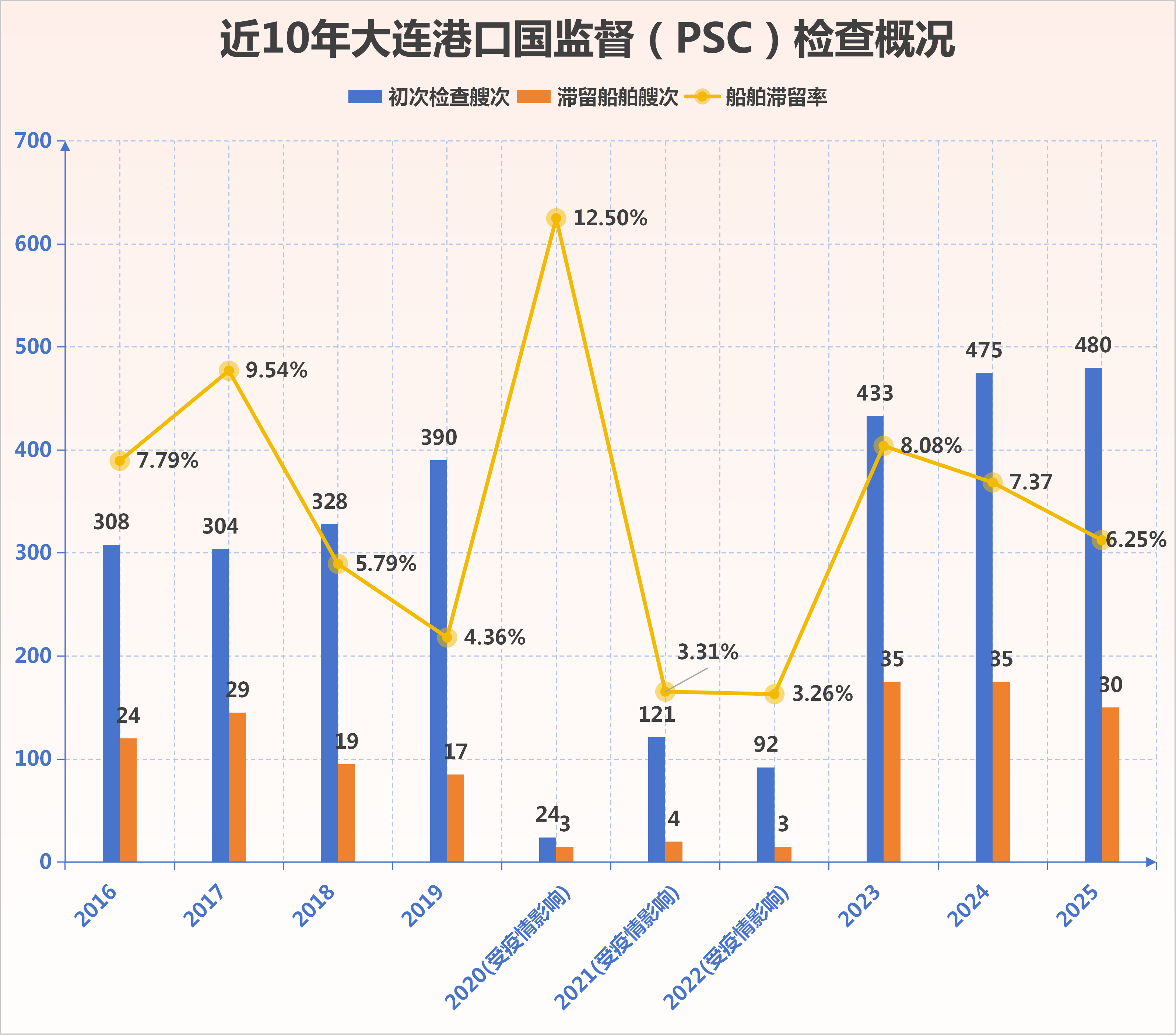 2016至2025年的近10年间,大连港口国监督(PSC)检查数量逐年提升(排除疫情因素影响)。船舶滞留率近三年呈整体稳定下降趋势。