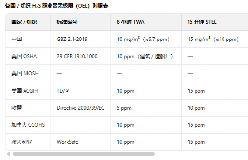 H₂S 的 PC-TWA 为 10 mg/m³(≈6.7 ppm)