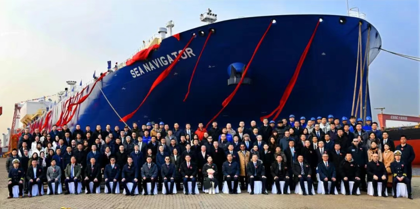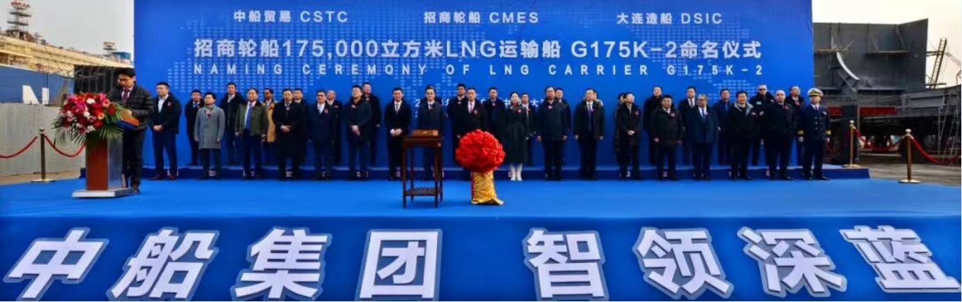 1月28日,招商轮船在大连造船批量订造的“17.5万立方米液化天然气(LNG)运输船项目”2号船交船暨命名仪式在大连举行,该船交付后将服务于长约租家中化石油的LNG运输需求。招商轮船总经理王永新为新船命名并讲话,招商金控副总经理孙献为新船砍缆。大连造船总经理林吉明、中化石油副总经理夏尚分别在仪式上致辞。