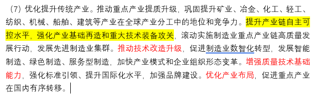 增强全球竞争力:文件指出,“优化提升传统产业。推动重点产业提质升级,巩固提升矿业、冶金、化工、轻工、纺织、机械、船舶、建筑等产业在全球产业分工中的地位和竞争力。”