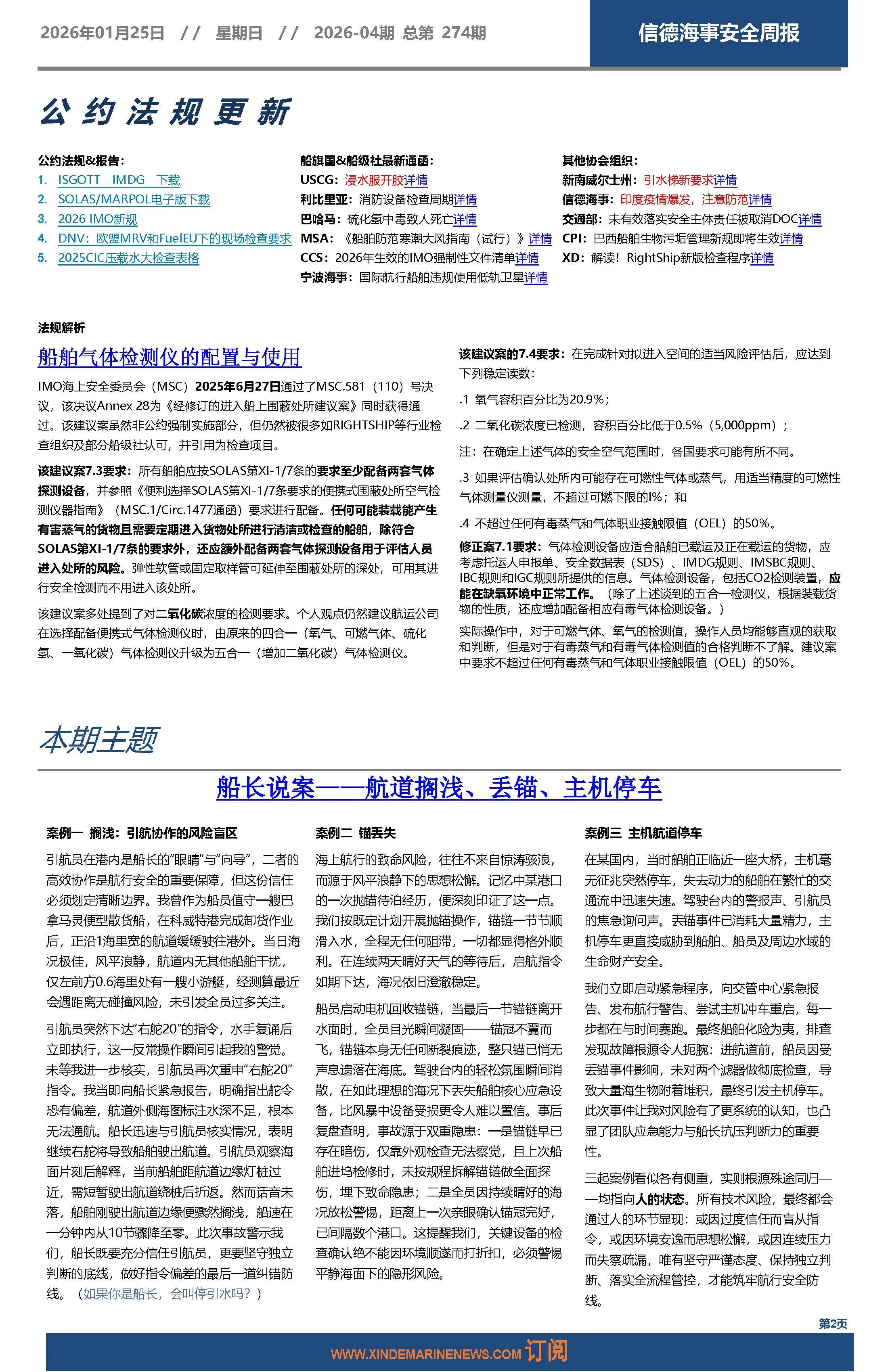 信德海事一直把实现海上更安全当作我们的愿景之一。2020年8月22日正式推出《信德海事安全周报》,2021年1月,《信德海事安全月报》上线;2021年2月,《信德海事安全指南》上线;2025年7月,《MARINE SAFETY BULLETIN》上线,实现中英双语发布。如有船公司需订阅以上产品,请发送邮件:safety@xindemarine.com,或联系主编:18641784019(微信)