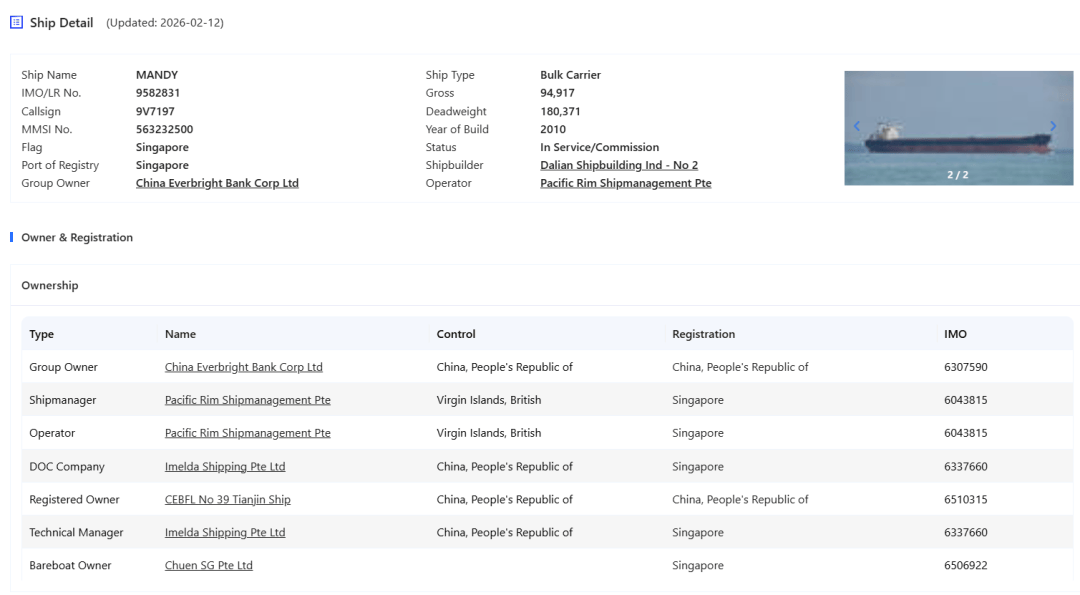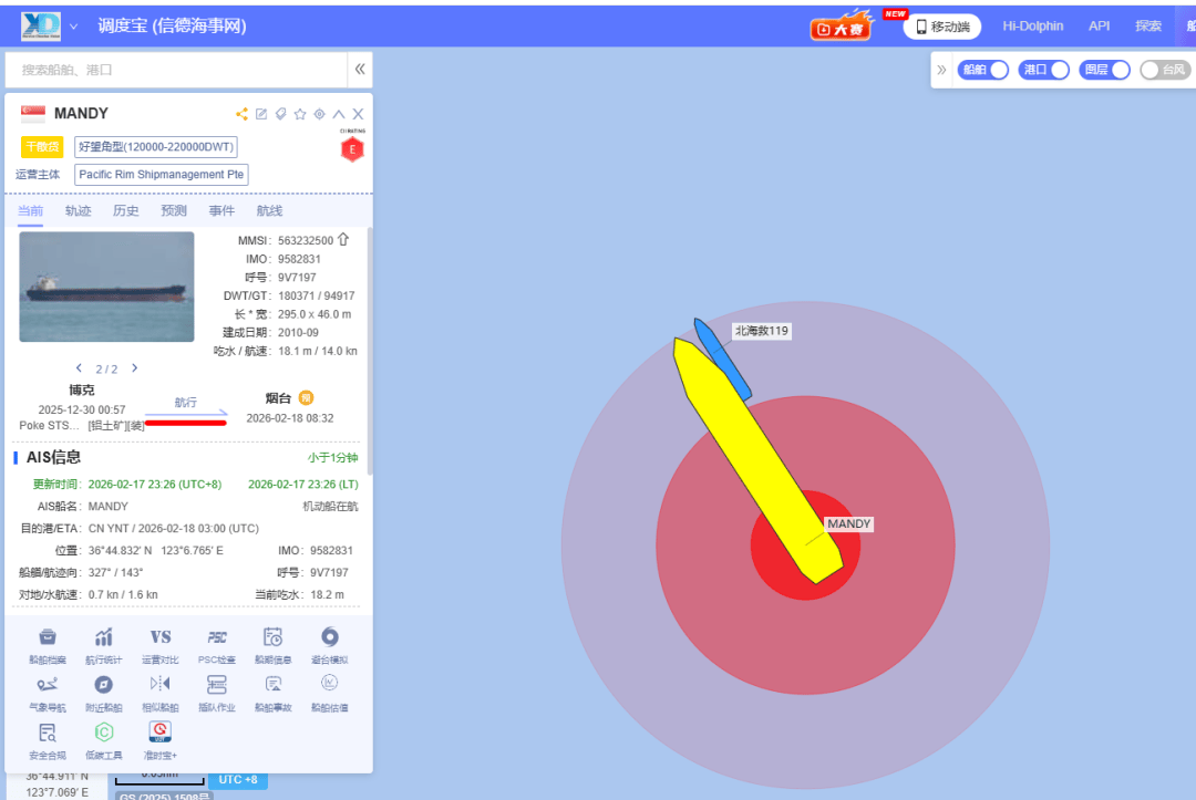 公开信息显示,MANDY轮船长295米,船宽46米,180371dwt,是一艘标准的好望角型(Capesize)干散货船舶,本航次该轮从几内亚前往烟台。