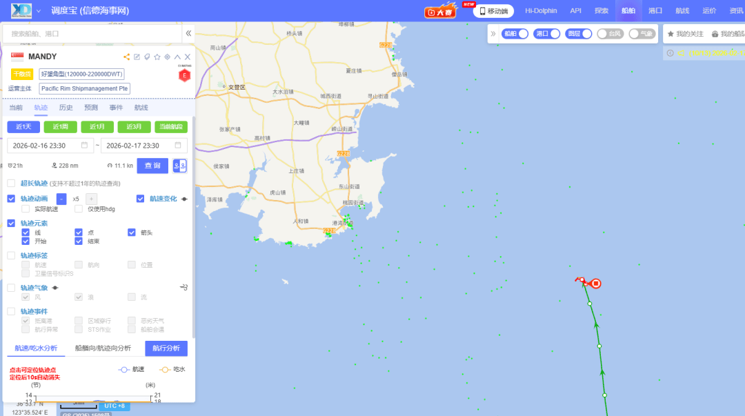同样根据船视宝绘制的MANDY轮卫星AIS轨迹显示,该轮从北京时间2月17日(大年初一)1726开始出现轨迹异常(如下图,出现降速和航向变化,随后出现漂航的情况)。