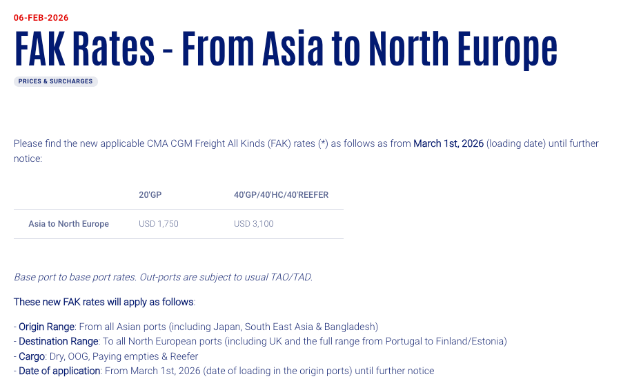 亚洲-北欧:自3月1日(装货日)起,亚洲至北欧所有货物适用新的FAK(均一费率),有效期至另行通知;