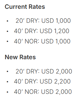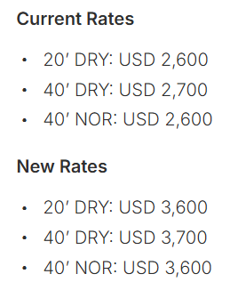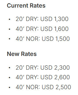 亚洲-拉美:自3月1日起,亚洲至南美西海岸、墨西哥、中美洲、南美东海岸及加勒比地区(含巴拿马)的GRI(综合费率上涨),此次调整直接体现为每个集装箱运费增加1000美元。