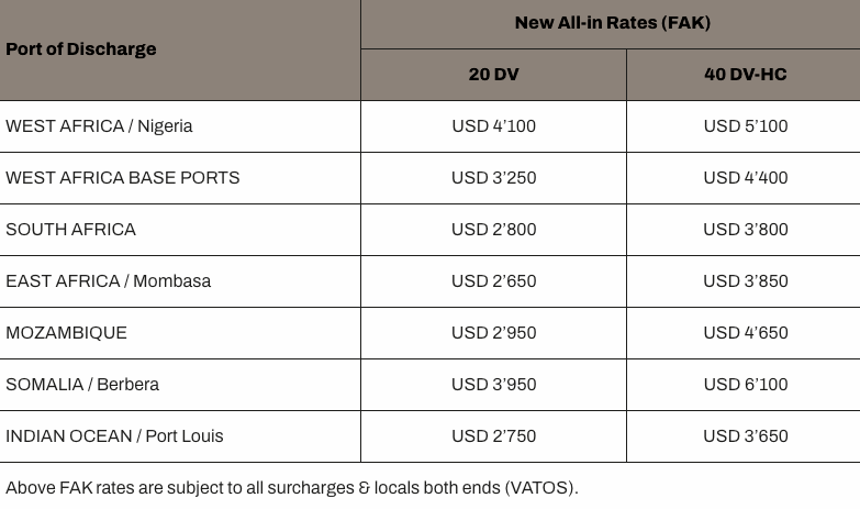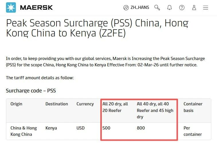 自2026年3月1日起,远东至肯尼亚(1000美元/TEU)、坦桑尼亚(700美元/TEU)、莫桑比克(850美元/TEU)及南非(1000美元/TEU)航线,将对所有货物征收旺季附加费(PSS);远东至西非所有地区的干货和冷藏货,同步征收旺季附加费,标准为1000美元/TEU,进一步推高非洲航线物流成本。
