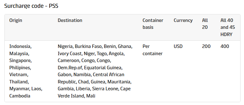 自2026年3月1日起,远东至西非多个国家实施PSS: