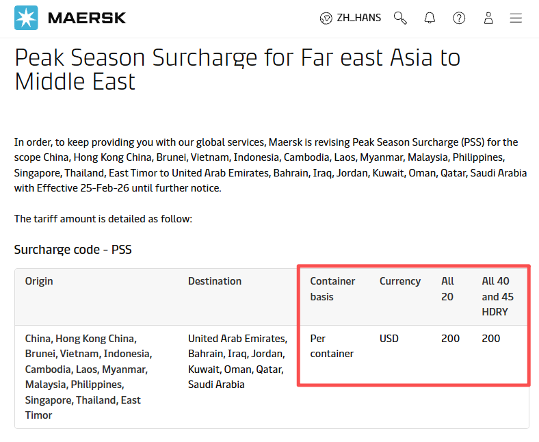 2026年2月25日起,对远东至中东航线出口货物实施PSS: