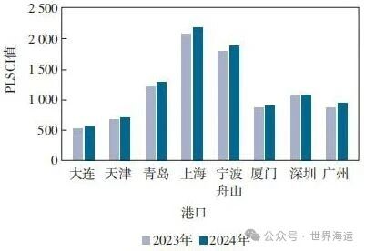 国际海运连通性方面,我国主要航运中心在全球海运网络中处于领先的枢纽地位。根据联合国贸易和发展会议 ( UNCTAD ) 2024年发布的班轮运输连通性指数 ( PLSCI,取全年平均值 ),我国上海港、宁波舟山港、青岛港、深圳港、广州港分别位列全球第一、第二、第五、第七和第十。各港口的PLSCI值见图5。