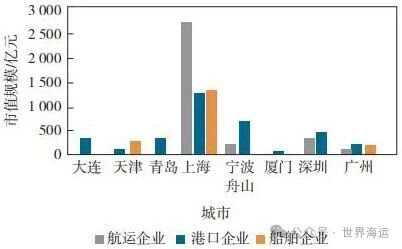 港航龙头要素集聚度方面,目前国内大型航运企业主要分布在上海 ( 中远海运、中远海能、中谷等 )、广州 ( 中远海特、中集等 )、宁波 ( 宁波远洋等 ),远洋船舶注册高度集中于上海 ( 按照机动船净载重吨计算占比约45% ),船舶制造企业主要分布在上海 ( 沪东中华、江南造船、外高桥造船等 )、江苏 ( 扬子江、新时代等 )、广州 ( 广船国际 ) 等。各航运中心城市本地上市航运、港口、船舶企业市值规模见图8。