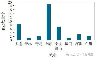 船舶交易服务方面,我国航运中心城市的船舶交易服务主要有船舶经纪人和船舶交易平台两种形式。我国船舶经纪业务发展起步较晚,但近年来增长迅速,目前主要集中在上海、大连、宁波等地;船舶交易平台以浙江拍船网、广州航运交易所为代表。各航运中心城市本地船舶经纪企业数量见图9。