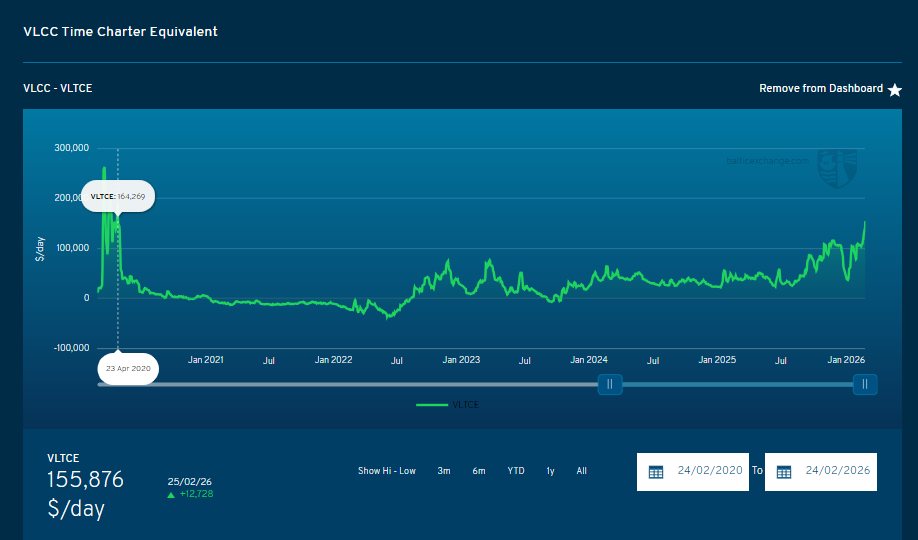 更值得注意的是,波罗的海交易所(Baltic Exchange)口径的VLCC TCE亦同步走强:截至2月25日,VLCC TCE读数已升至约15.6万美元/天的极端高位,显示现货收益体系正在被整体抬升,而非个别单点脉冲。
