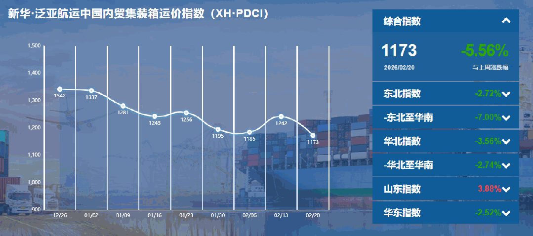 核心提示:本期(2026年2月14日至2月20日)新华·泛亚航运中国内贸集装箱运价指数(XH·PDCI)报1173点,较上期(2026年2月7至2026年2月13日)下跌69点,跌幅5.56%;同比下跌6点,跌幅0.51%;6只区域子指数一涨五跌,4只流向指数全部下跌。